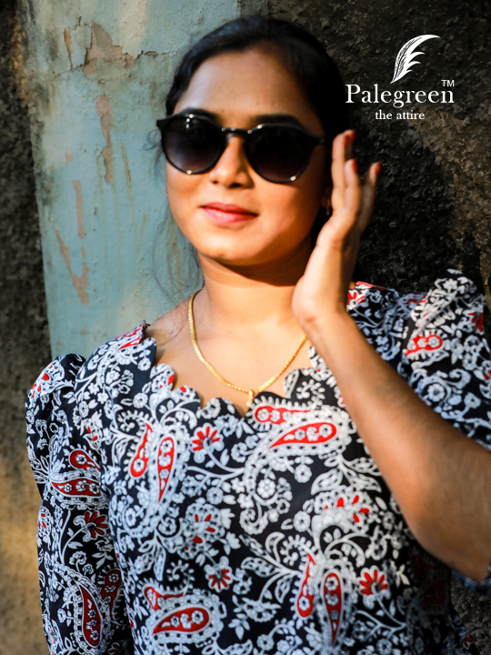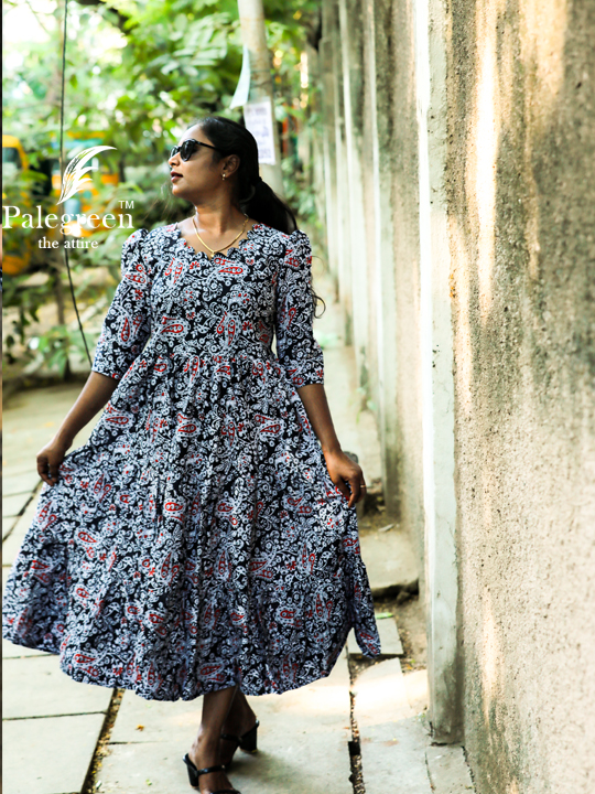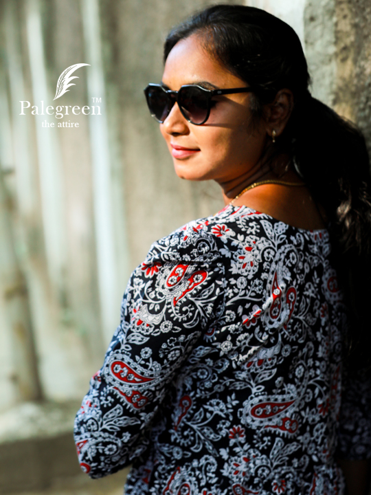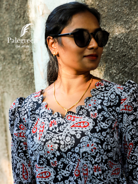| Step into effortless sophistication with our Midnight Scallop Belle Frock, where timeless design meets modern elegance. Crafted from soft, breathable cotton, this piece offers unmatched comfort while keeping your look refined and stylish. The beautifully crafted scallop neckline adds a delicate, feminine charm, while the small puff sleeves bring a subtle vintage touch. Set against a rich black base with intricate prints and hints of red, this frock creates a striking yet graceful statement—perfect for both casual outings and evening moods.