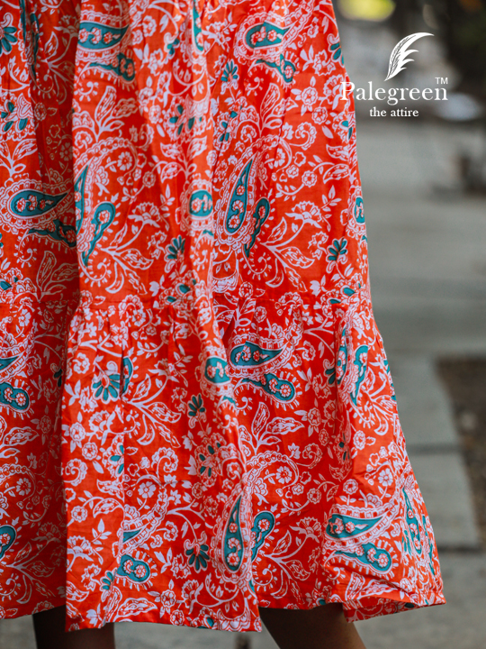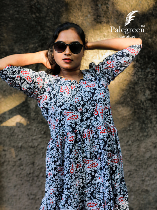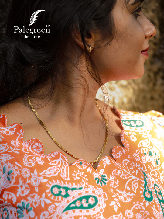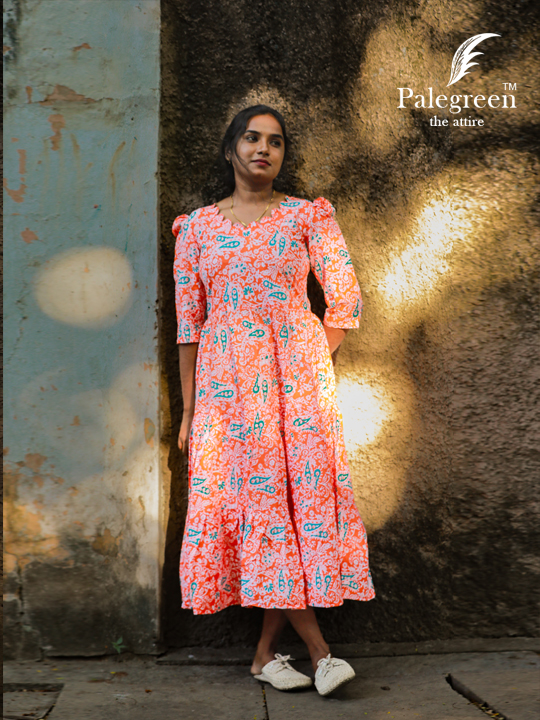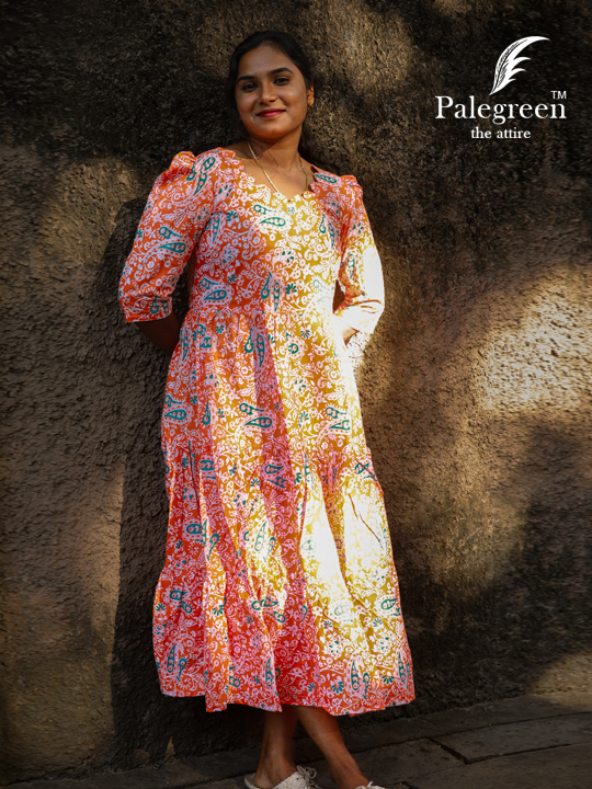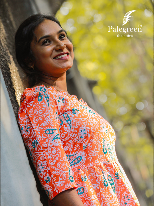 | Bask in effortless elegance with our Sunflare Belle Frock, designed to capture the warmth of golden sunlight. Crafted from soft, breathable pure cotton, this dress ensures all-day comfort with a graceful, flowy silhouette. Featuring delicate small puff sleeves that add a touch of vintage charm, and a beautifully detailed scallop neckline that enhances femininity, this piece is both playful and refined. The vibrant sun-kissed print brings a lively, radiant feel—perfect for daytime outings, casual gatherings, or relaxed festive moments.